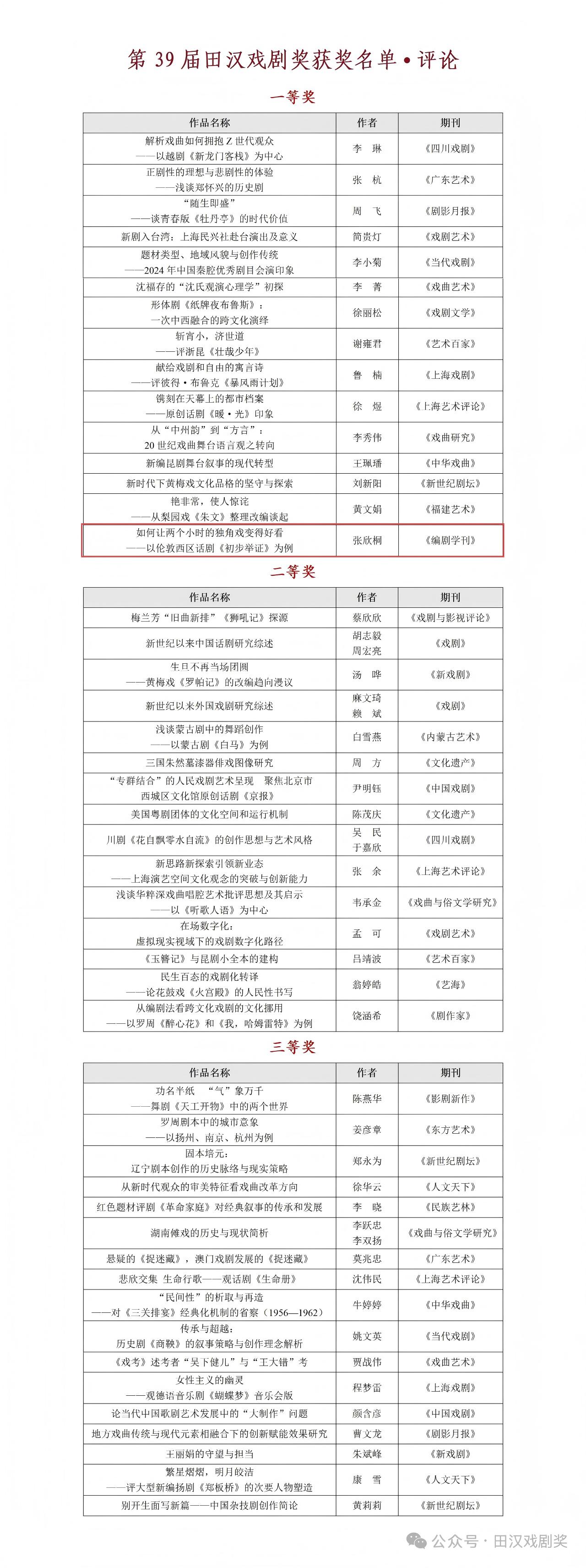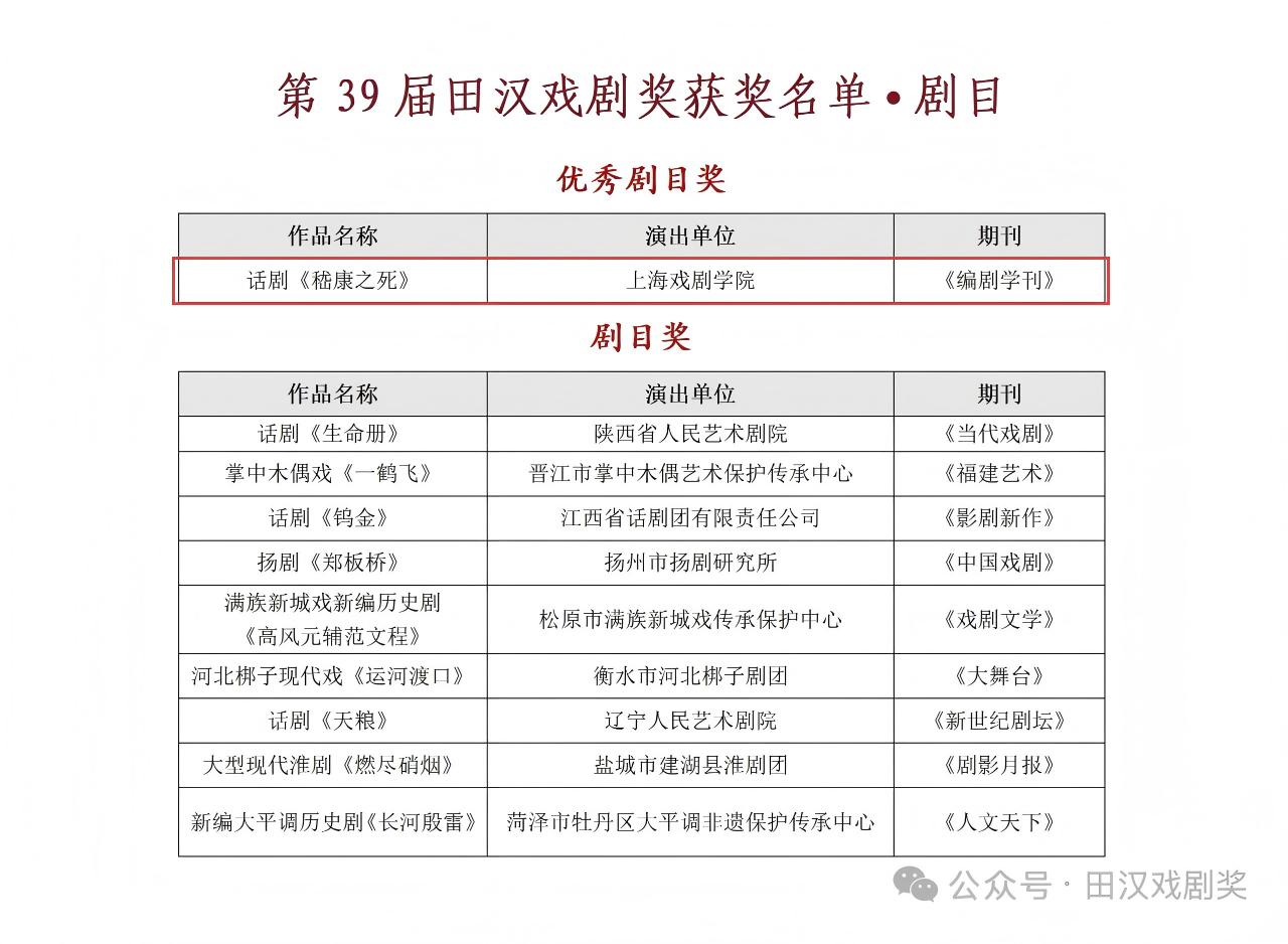 《编剧学刊》创办人、主编,戏文系陆军教授出席参评活动,本辑轮值主编、上海戏剧学院教务处副处长(主持工作)李世涛副教授代表学刊介绍报送的2部作品、3篇文章。最终,2部作品和3篇文章均斩获佳绩:话剧《嵇康之死》(编剧:肖留,导演:伊天夫,演出单位:上海戏剧学院)获得唯一优秀剧目奖,话剧《北京塔楼》(编剧:李宝群)获得剧本类一等奖。《如何让两个小时的独角戏变得更好看——以伦敦西区话剧<初步举证>为例》(作者:张欣桐)获得评论类一等奖,《人工智能(AI)编剧的叙事自主与伦理反思》(作者:苗若木)获得理论类二等奖,《听见契诃夫:论<樱桃园>中“绷断的琴弦”》(作者:郑钲)获得理论类三等奖。