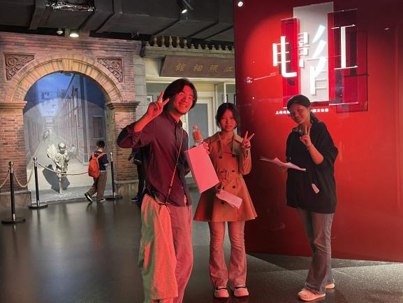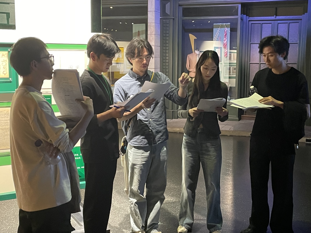 当天下午,师生一行前往上海电影博物馆进行实地排练。不同于首次参观时的实地采风,此次同学们带着完整剧本而来,从“参观者”转换为“创作者”的身份。当文字真正落地于具体空间,笔下的剧本开始经受现实的检验,展厅的实际空间、展品的陈列位置、观众的行进动线都对剧本提出了新的要求。大家结合展陈空间的布局特点分组排练,重点就场景转换衔接、角色与展区的适配度、观众视角的引导等问题展开实地打磨,在真实空间中不断调整和完善剧本。