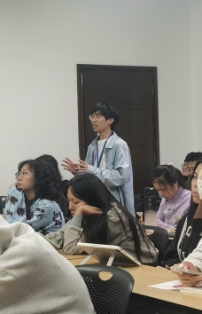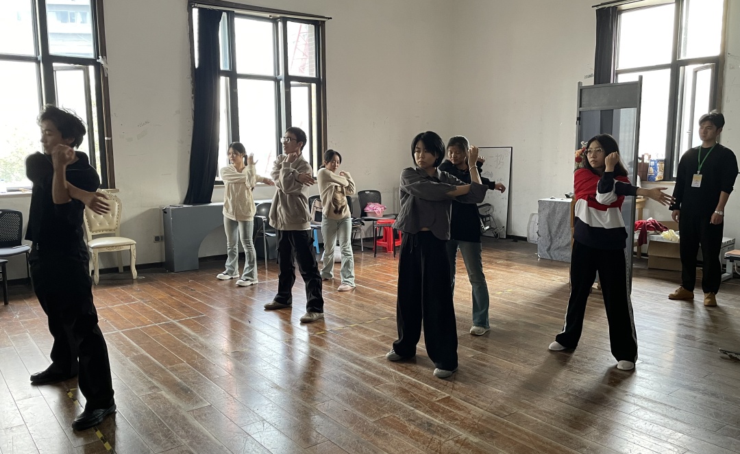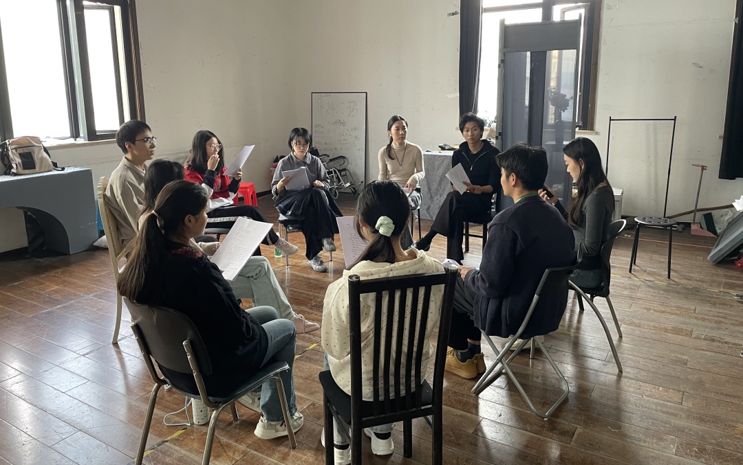 剧本完成后,同学们进入排练阶段,在排练实践中不断完善剧本。一部作品的诞生需要团队的协作努力,程宇月博士特别邀请上海戏剧学院黄灏龙、云南艺术学院杨政坤、刘孜颖、赵伟普等参与舞台呈现创作指导。11月1日,学生们开始尝试表演训练。通过肢体协调性练习、情绪张力把控等环节,同学们逐渐学会用身体感知空间、用肢体传达情感,从表演者的角度理解剧本的可行性与表现力。随后的剧本围读环节,学生们根据自己创作的人物角色进行台词演绎,对笔下人物的情感世界有了更深刻的理解。