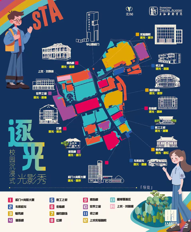 值得一提的是,整个观演路径设计为一场“追光之旅”。观众自校门启程,在移步换景中依次解锁叙事节点,既是观赏者,也成为行走在光影戏剧中的一部分。许多校友表示,这场秀让他们“看到了一个既熟悉又崭新的上戏”。