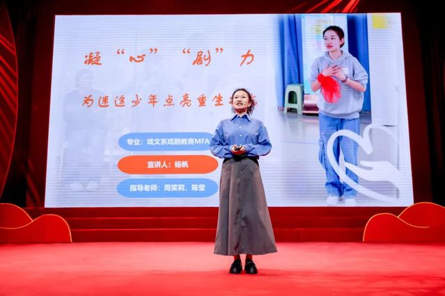 戏剧文学系硕士研究生杨帆以《凝“心”“剧”力 为迷途少年点亮重生之光》为主题进行了项目分享。该项目在第十九届“挑战杯”全国大学生课外学术科技作品竞赛等赛事中荣获佳绩。项目团队以戏剧教育助力罪错未成年人教育矫治,在上海、青海、云南多地都留下了足迹。杨帆表示将继续以戏剧为媒介,“在孩子们心中埋下善意的种子”,助力他们走向新生。