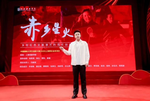 艺术科技与管理学院硕士研究生闫威旭,作为《赤乡星火——乡村红色文旅演艺的范式创新者》团队负责人,介绍了项目团队积极响应乡村振兴与文旅融合国家战略,深入革命老区,推动当地生态、业态、形态、文态实现“四态合一”,为乡村发展提供可持续的实践方案。该项目多次被学习强国、央视新闻联播等主流媒体报道,并荣获中国国际大学生创新大赛(2025)上海赛区红旅赛道金奖。