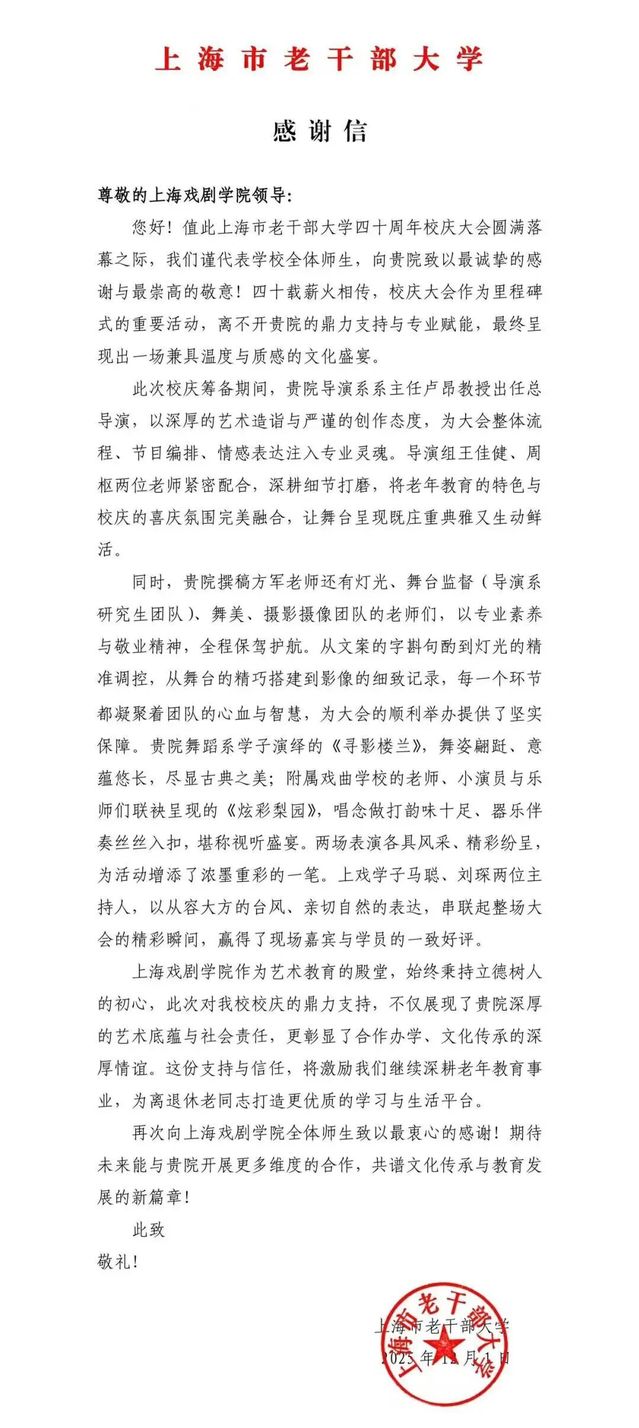 在上海戏剧学院建校80周年当日,上海市老干部大学专门发来感谢信,对上海戏剧学院的鼎力支持与专业赋能致以诚挚谢意,认为此次合作再次彰显了两校之间的深厚情谊,期待未来继续共谱文化传承与教育发展新篇章。(供稿:导演系)