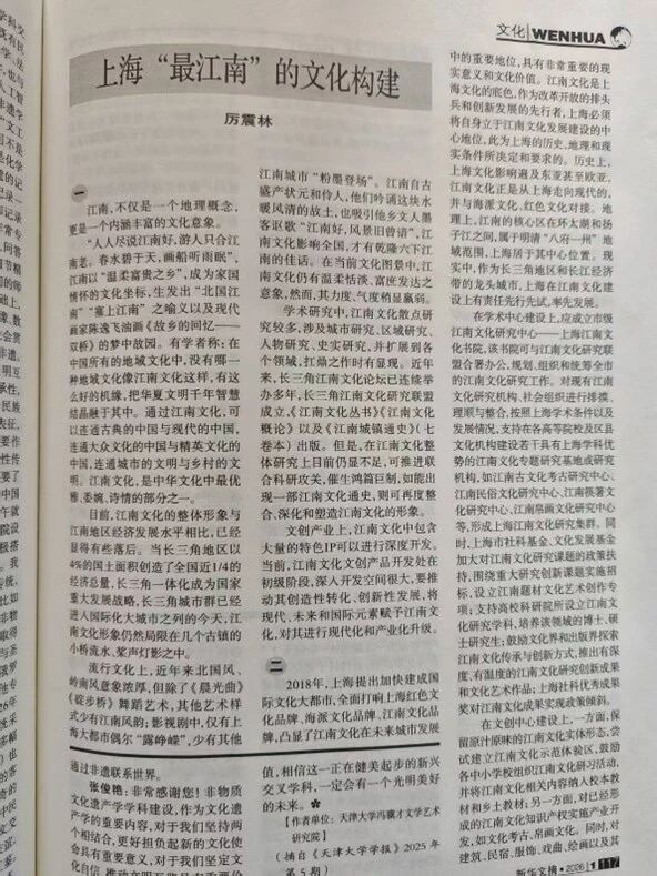 继2025年第13期长文转载《强叙事、N次刷屏和况味化表演——近年中国电影表演艺术观察》之后,《新华文摘》2026年第1期又全文转载了著名电影学者厉震林教授的文章《上海“最江南”的文化构建》。
